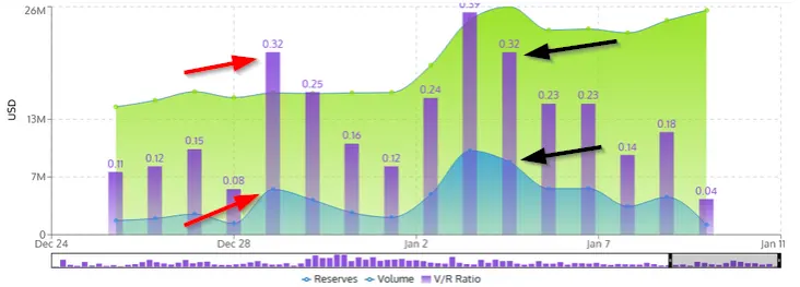 Look at the red arrows above pointing to the .32 VR ratio and the spike in the blue area of the graph representing volume. As you can see, when volume spikes and there is no corresponding spike in reserve size, your fee revenue goes up considerably. If you look at the black arrows, you can see that with a larger reserve size (the green area) it takes more volume to make the same .32 VR ratio profit.