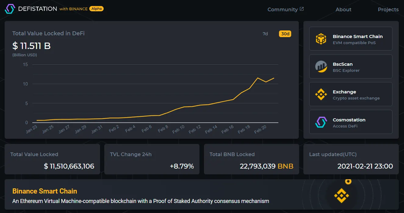 Going off that, the BSC arena is trying to breathe life into its own DeFi activities, so a natural starting point was creating a version of DeFi Pulse for BSC. The result? Defistation, which tracks data like BNB locked and volume around the BSC ecosystem.