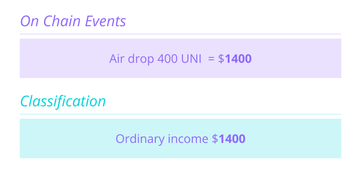 Suppose you received 400 UNI tokens from the Uniswap airdrop. At the time you claimed them, UNI was worth $3.5. In this case, you would recognize $1,400 of ordinary income from this airdrop (400 * $3.5). Depending on your marginal tax bracket, you would owe a percentage of this in income taxes.