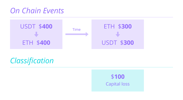 In this example, Tom would incur a $100 capital loss upon disposing of his ETH for USDT. This loss would get reported on his taxes and would deduct from his other capital gains.