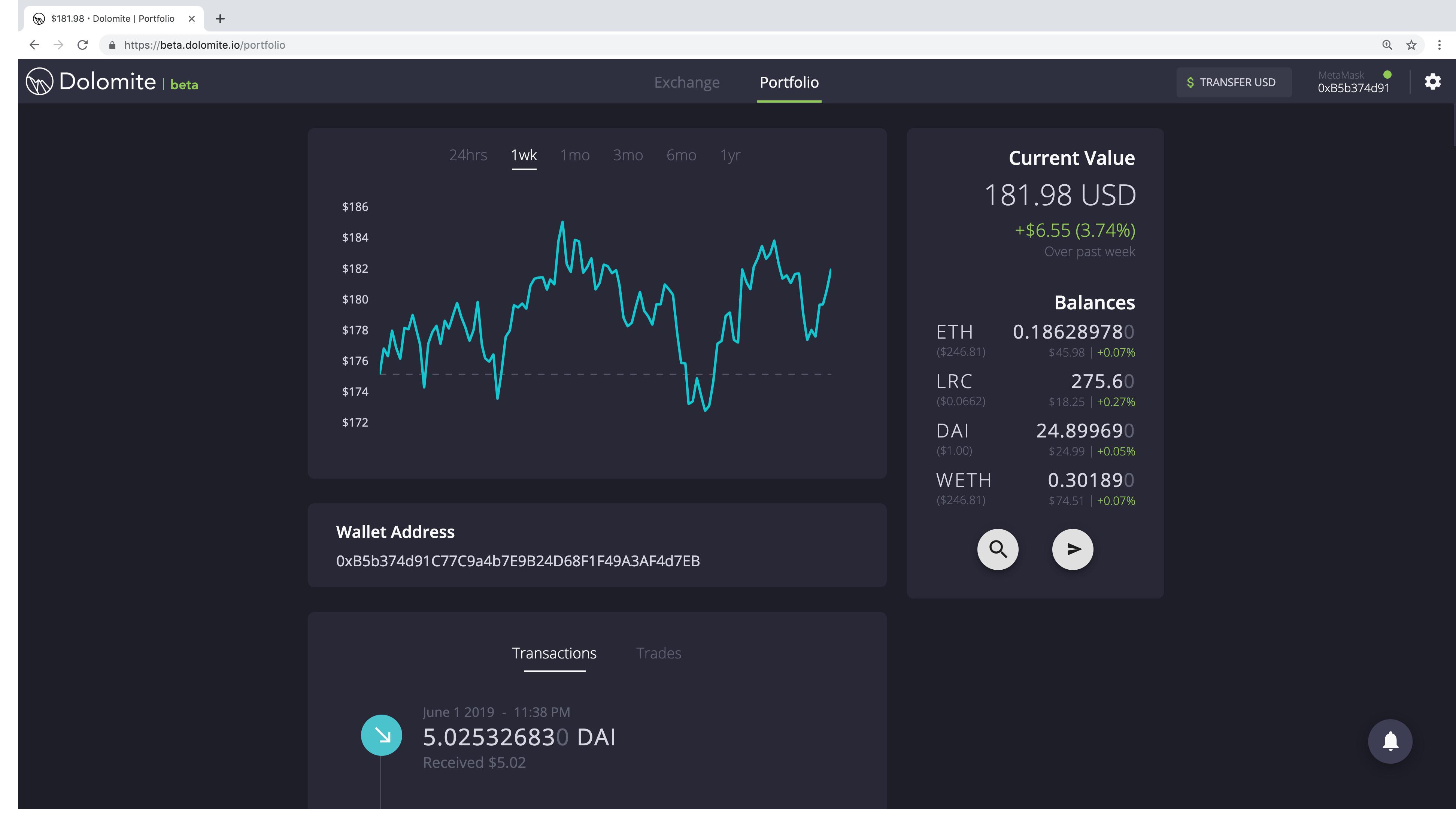 As traders, we found it a pain to keep open multiple tabs with token information, price charts, and 3rd party portfolio tracking applications. We wanted to bring that all together into one place. That’s why Dolomite comes with a built-in portfolio tracker, completely free and open to use. By connecting your Ethereum wallet or simply entering your public address, we generate a portfolio overview for you with a graph of past portfolio value, wallet transactions with cost basis, trade history with a breakdown of your gain/loss, and information on thousands of tokens.