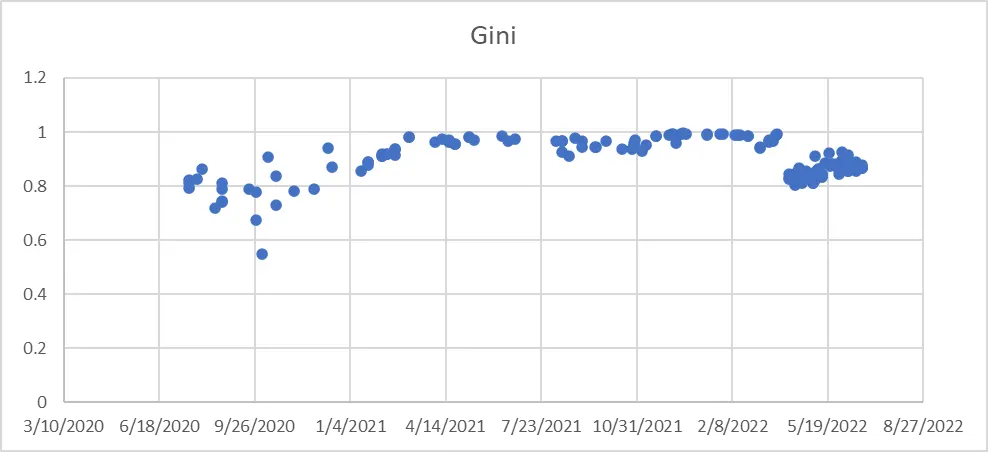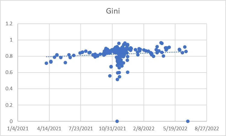 Looking at the distribution of the Gini coefficient, we can see that most points are within the 0.8 - 1 range. The platform allows users to delegate their voices, which is probably the reason for the high concentration level.
