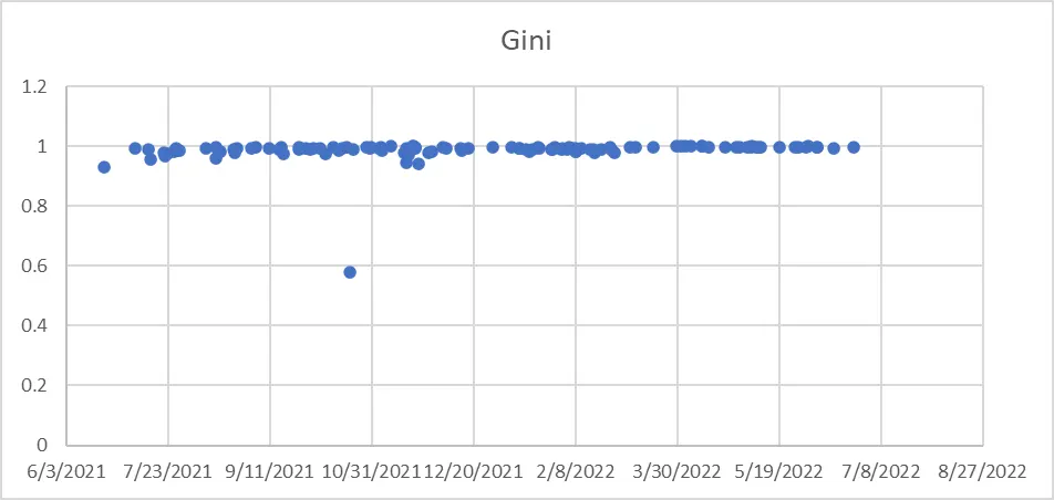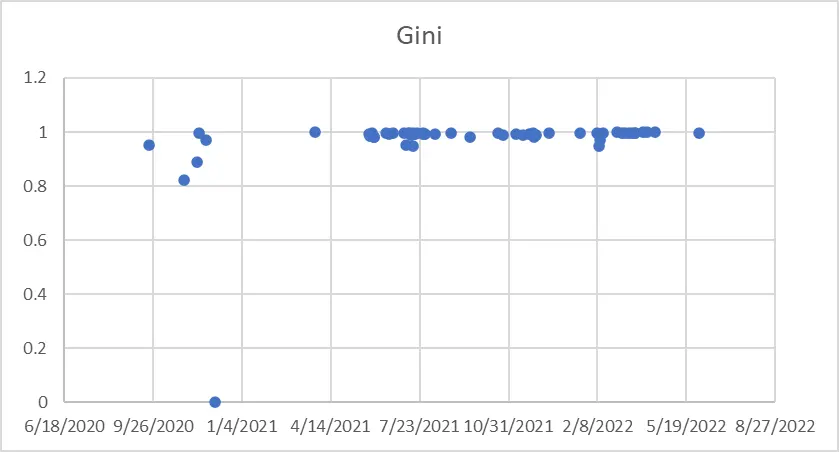 Since the main voting platform in OlympusDAO is Snapshot, we calculated a Gini coefficient. The coefficient was calculated separately for each proposal on Snapshot and put on the time graph: