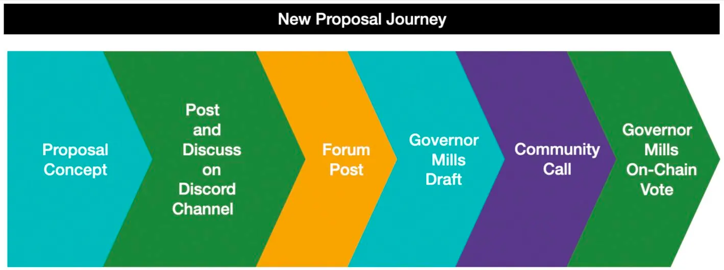 The process starts with idea discussion on social, community calls, and forum posts to check sentiment on the proposal. The proposer should present the code for the community review to get a social consensus before on-chain voting.