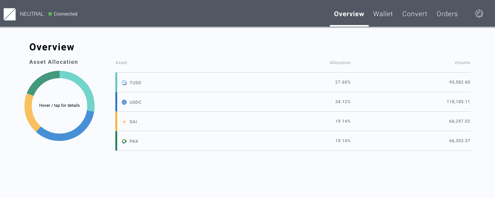 The first product is Neutral Dollar (NUSD), a basket of stablecoins. The composition of the basket can change to complement the growth of the stablecoin landscape, and the Neutral Dollar represents the exposure of the underlying collateral. Anybody can collateralize supported stablecoins for NUSD, and anybody can also take NUSD and redeem for any constituent. For example, a user can route USDC into NUSD, and break apart NUSD into PAX. This is all done and verifiable on-chain, so users can know the exact value of Neutral Dollar and the associated risk profile.