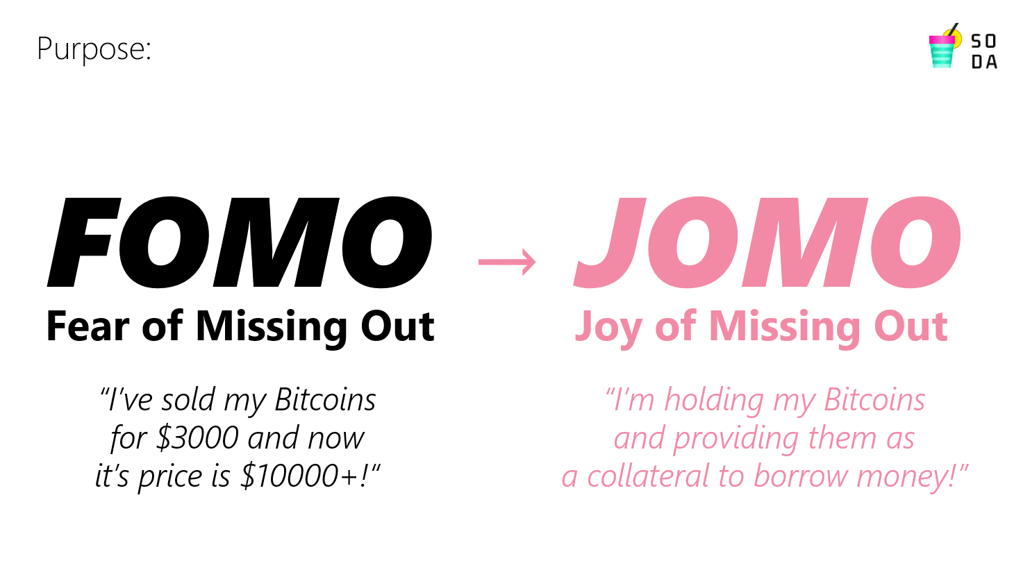 Our mantra in SODA is you should never sell your Bitcoins. The problem we see is that people want (but can’t) hold Bitcoins forever. They need money to pay for rent, leisure, etc. When selling, they lose a scarce digital asset. The solution that SODA offers is that users can now provide Bitcoins as a collateral to borrow crypto. They can enjoy BTC’s price upside and save Bitcoins. There is no KYC or credit score check on SODA since we believe in the open global access of our lending and borrowing services.