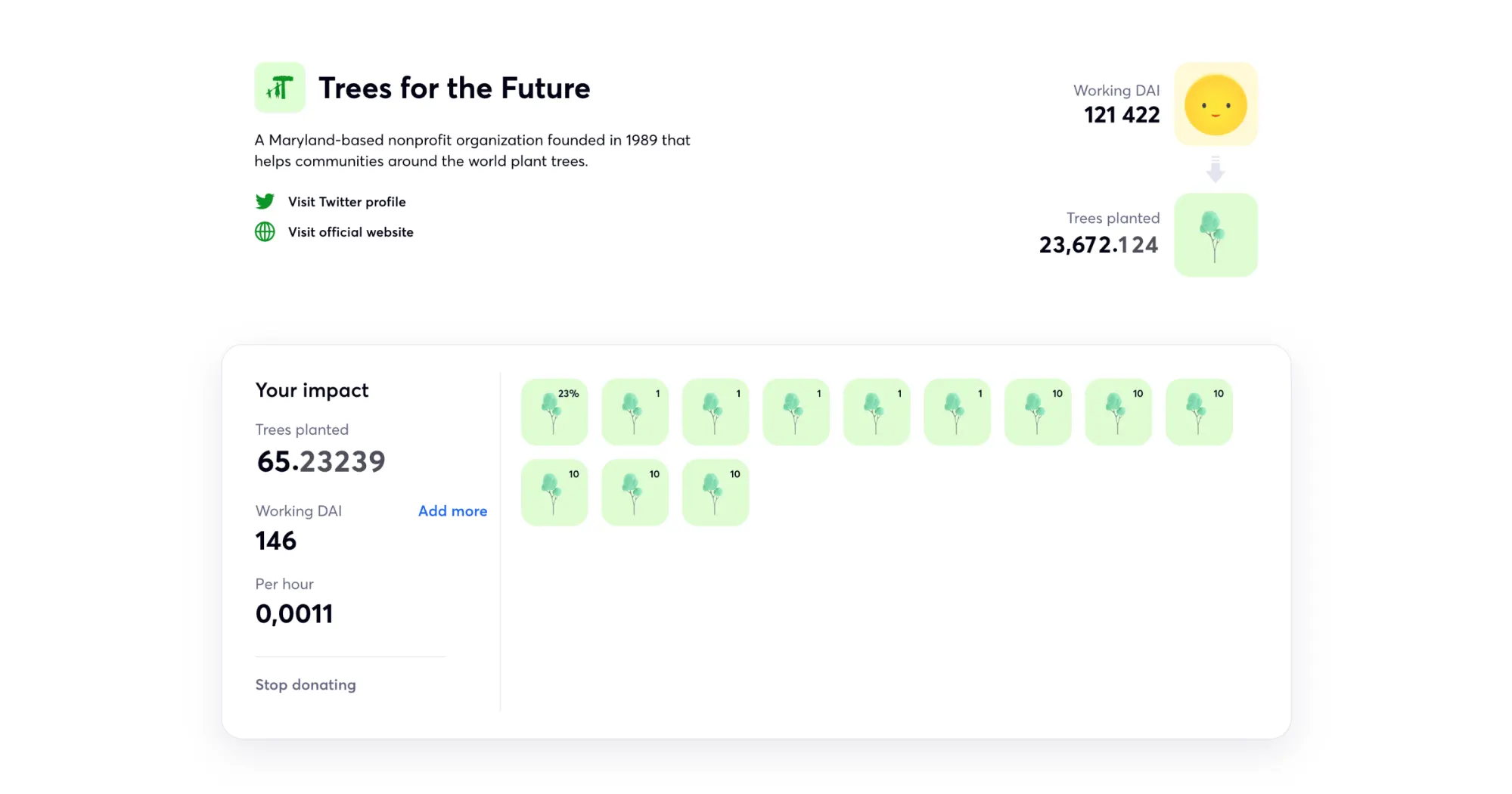 As soon as you use deposit input in the Spendless Campaign, you will instantly see the estimated impact and an exact breakdown of the costs. We want to be very transparent and upfront about everything, so you always feel in control. After you start donating, you can see a fun and visually driven narrative of the impact your deposits have made and continue to make. You can watch the next 0.001 of a tree tick upward and see a record of how much impact you’ve already made.