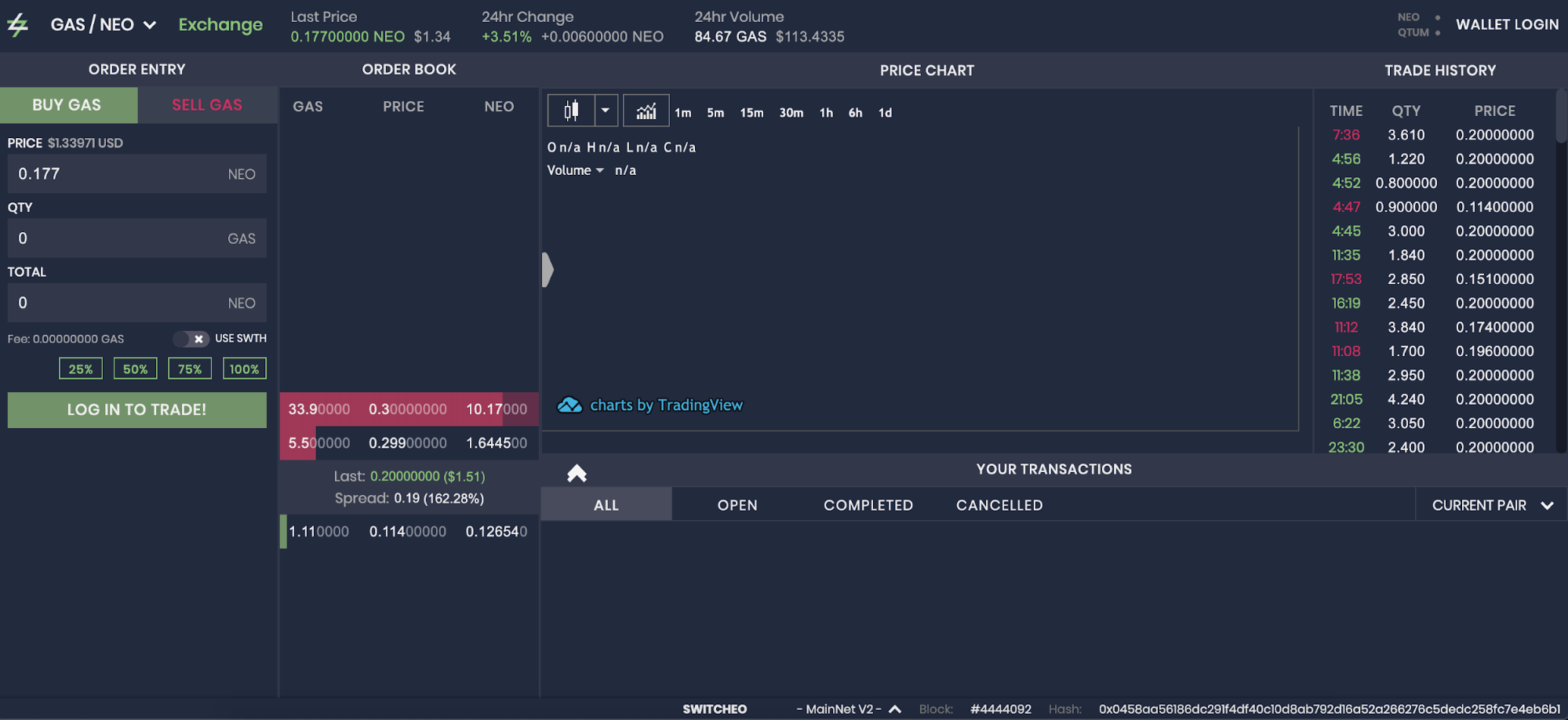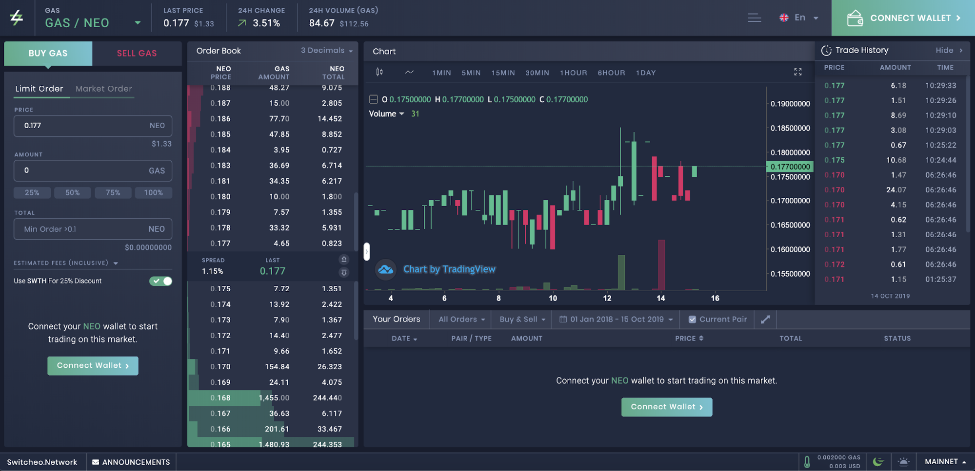 Trades on our exchange have a 0.2% fee - only on taker trades and is reduced to 0.15% when using SWTH tokens to pay for the fee on NEO trades. SWTH is our NEP-5 utility token on the NEO blockchain, and it’s currently utilizing a burn model, where all fees paid with SWTH is burnt. Our current target markets are users who actively trade Ethereum, NEO, and EOS tokens, and we’re looking to expand this to BTC in the near future.