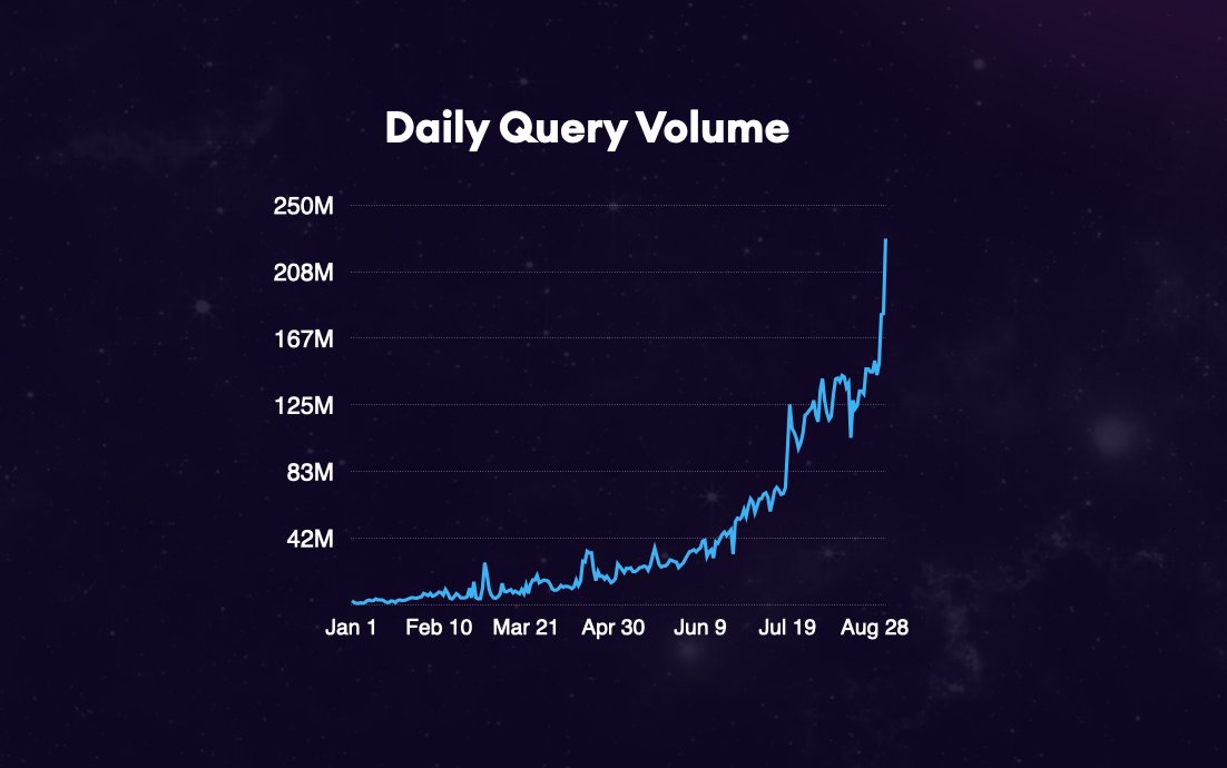 We have been working on The Graph for almost three years. During this period, the market cooled off and many speculators left the space, but teams like ours that were truly committed to the vision of Web3 and decentralization kept building. Strategically, we decided to build a hosted service first in order to bootstrap demand for the network before fully decentralizing. This allowed us to get a product in users’ hands right away, and as a result, we could test, iterate, and add key features based on their feedback. It also allowed us to stabilize the codebase and put it through its paces as we were powering live production environments for large projects. In June of 2020, we hit over a billion queries in a month as DeFi traffic grew exponentially. By August we were doing over 4 billion. On a parallel track, we were designing and developing the decentralized network.