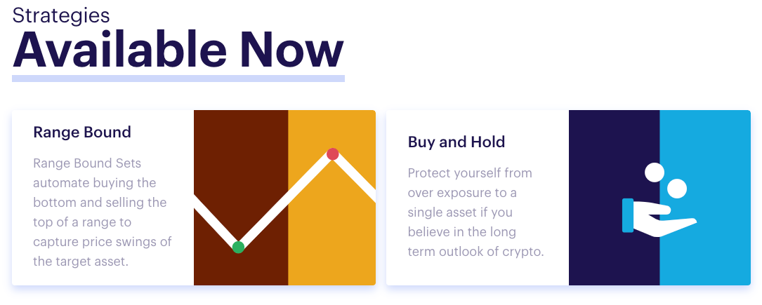 For example, if you believe that the price of Bitcoin will go sideways for a while, you might consider executing a Range Bound strategy where you sell when the price of Bitcoin goes up, and buy when the price of Bitcoin goes down, effectively increasing the amount of Bitcoin that you have. We have a collection of Sets that execute this exact strategy handling either Bitcoin or Ethereum with Dai that’s listed on TokenSets today.