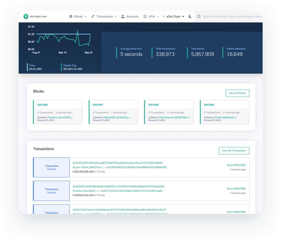 One of the things we take pride in is our approach to development and release - we are known for iterating and shipping in short cycles. After the idea for the xDai Stable Chain was established, we needed to move fast. With DevCon IV around the corner, a deadline was set to release v1 of the Stable Chain by the end of October 2018. After some back and forth, we chose Dai to be the stablecoin of choice for several reasons: Dai is algorithmically stable, there is an exciting roadmap with multi-collateral CDP (Collateralized Debt Position), and the Maker project has a friendly approach to new development. By the end of October 2018, the xDai Stable Chain was live and integrated into BlockScout, the open-source explorer.