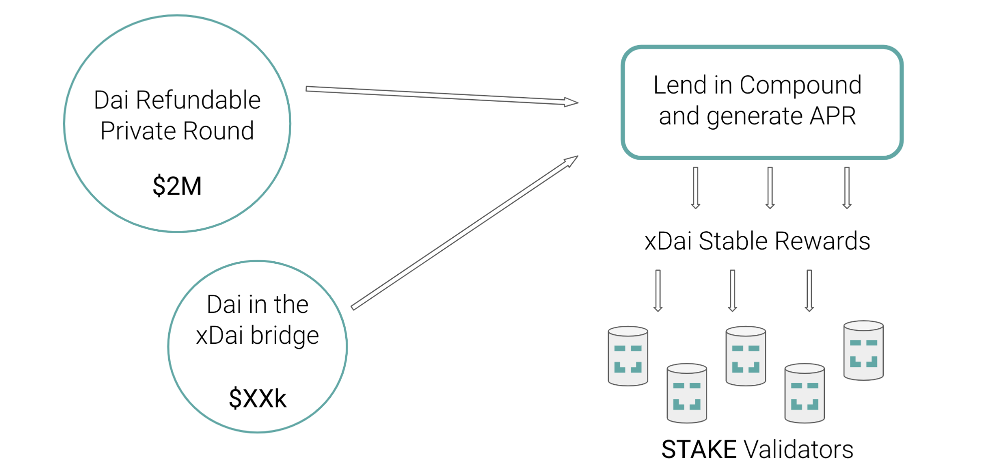 When the xDai DPOS protocol starts, a large amount of DAI would be locked in the bridge (and converted to xDai in the protocol). This locked DAI is provisioned to a lending mechanism where it accumulates interest, and this interest, in turn, provides staking rewards.